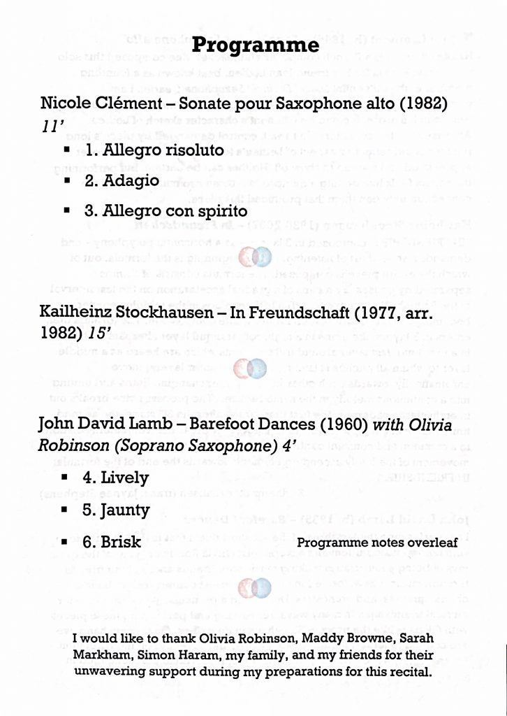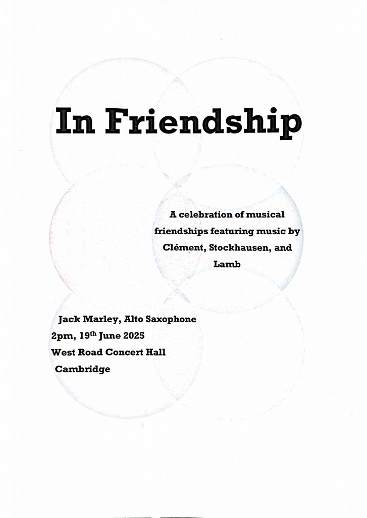 Jack began his studies with me at the Royal College of Music Junior Department and continued to work with me throughout his time at Cambridge University. At the RCMJD he was a key member of the saxophone ensemble and saxophone quartet, in addition to developing his saxophone skills and working as a composer. After graduating from the RCMJD and moving to Cambridge, Jack’s lesson with me were often remote with online lessons and lots of video and audio recording sharing. Alongside working on core repertoire, Jack has always been interested in contemporary repertoire, writing his own music for saxophone and other instruments, and bringing in influences from other areas of the creative arts, particularly theatre. Jack won a scholarship to receive lessons at the Royal Academy of Music in his final year at Cambridge, continuing to have some lessons with me in a consultancy capacity. For Jack’s final recital he chose a theme of Friendship, with Stockhausen’s epic In Freundshaft at the centre of this well crafted recital.